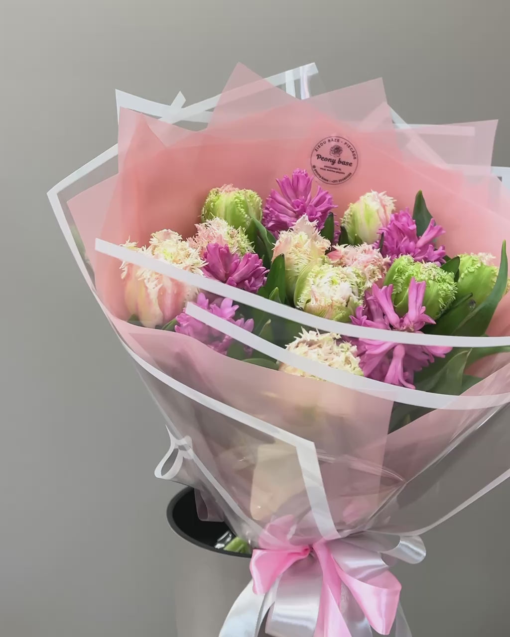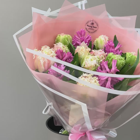 Tulips, hyacinths. The bouquet is arranged with matching colored paper.