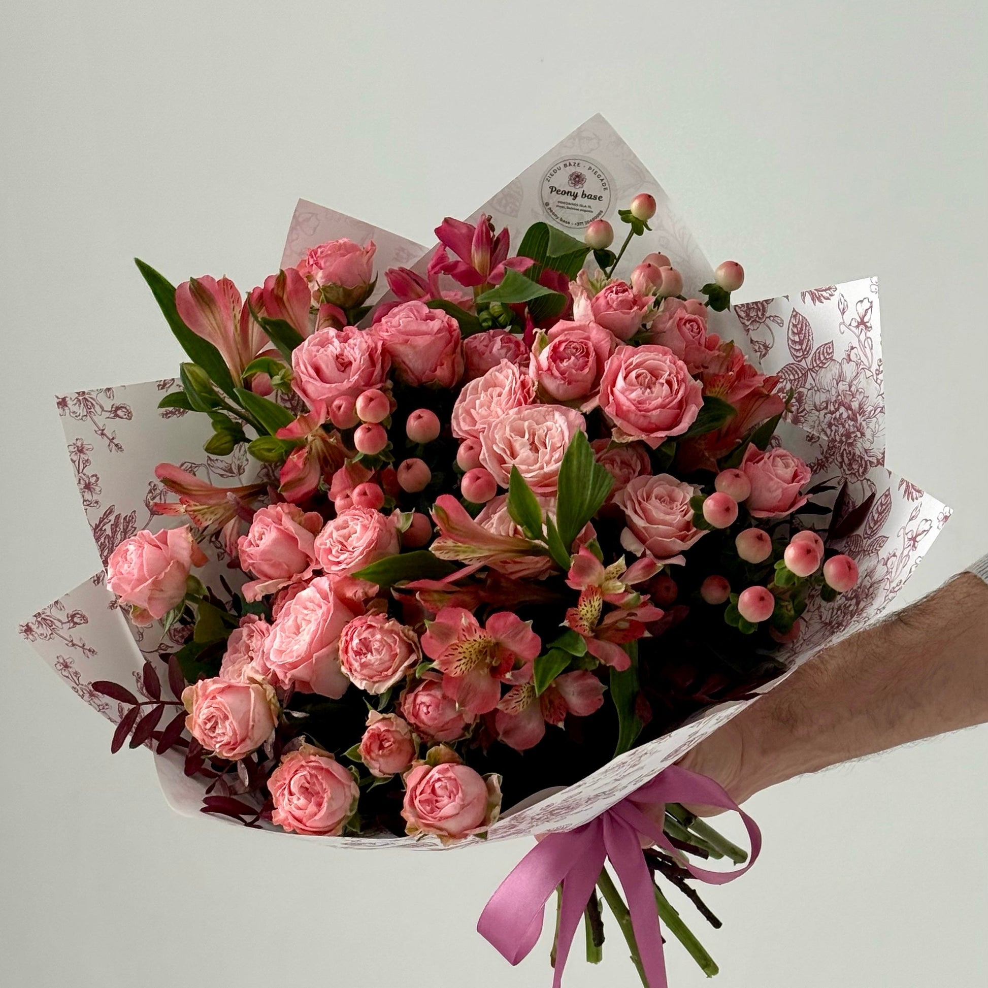 Spray roses, alstroemeria, hypericum, pistachia. The bouquet is arranged with matching colored paper.