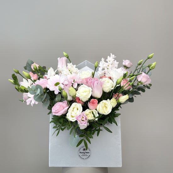 Krūmrozes, tulpes, hiacintes, lizantes, krizantēma, eikalipts, pistaču zaļumi.